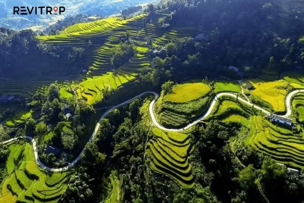 村庄附近有一个美丽的瀑布。这里的景色郁郁葱葱,绿意盎然。从杜嘉回到河江市的路虽然弯曲,但风景如画。