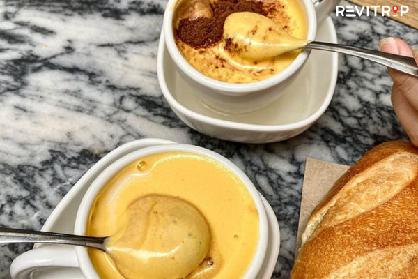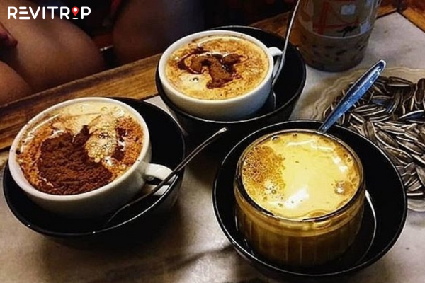 Your egg coffee Hanoi will arrive in a small cup (sometimes sitting in a bowl of hot water to keep it warm). The golden egg foam sits proudly on top of dark coffee. Don’t stir it immediately, the layered experience is part of the magic. Sip from the top first to taste the creamy foam, then let it naturally blend with the coffee as you drink.